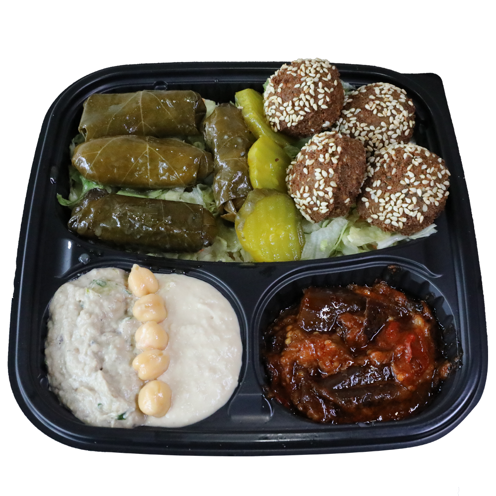 Hummus, baba gannouj, moussaka, falafel, dolma and salad.